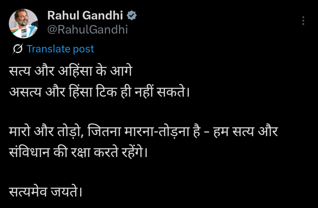 वही पटना में इस वारदात के बाद राहुल गांधी ने एक्स पर एक पोस्टर जारी करते हुए कहा कि सत्य और अहिंसा के आगे असत्य और हिंसा टिक नहीं सकते है । मारो और तोड़ो, जितना मारना तोड़ना है, हम सत्य और संविधान की रक्षा करते रहेंगे।